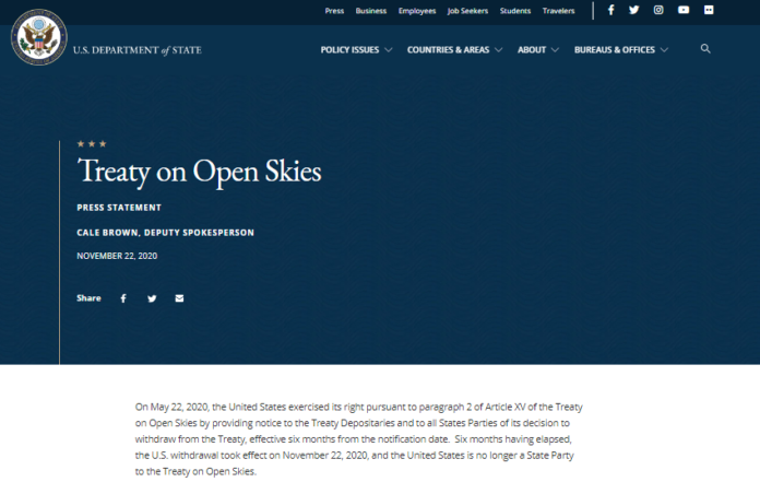 美国国务院11月22日发表声明,宣布正式退出《开放天空条约》。声明称,美国通报退出《开放天空条约》决定已过去6个月,该决定自11月22日起正式生效,美方现在不再是该条约的成员国。