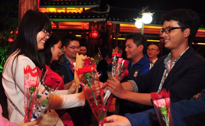 这一天,姑娘们和小伙子们都会拿着鲜花,若是看对眼,就会主动迎上去,与他(她)交换手中的鲜花,相互祝福。