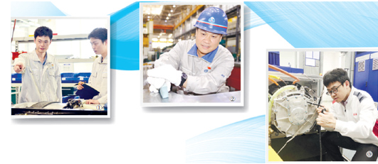 图①:刘会神(左)与同事研究解放汽车设计工作。  资料图片  图②:冯斌正在车间研磨模具。  陈 亮摄  图③:王斯博在实验室执行电检。  孙德强摄