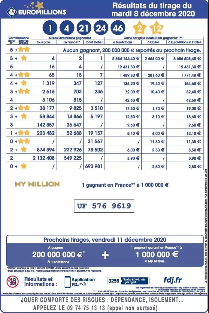 由于此次没有人完全选中5个正确数字(1、4、21、24、46)和两颗星(2、12),所以参与者们在周五还有一次机会来赢得2亿欧元的头奖。整个欧洲有四名玩家选对了5个数字和1颗星,这些幸运者中就包括那位比利时人。还有两名比利时同胞只选对了5个数字,他们每人获得19431.30欧元。