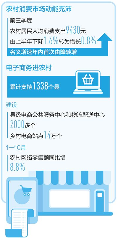 国家统计局数据显示:前三季度,农村居民人均消费支出9430元,由上半年下降1.6%转为增长0.8%,名义增速年内首次由降转增,农村消费市场动能充沛。