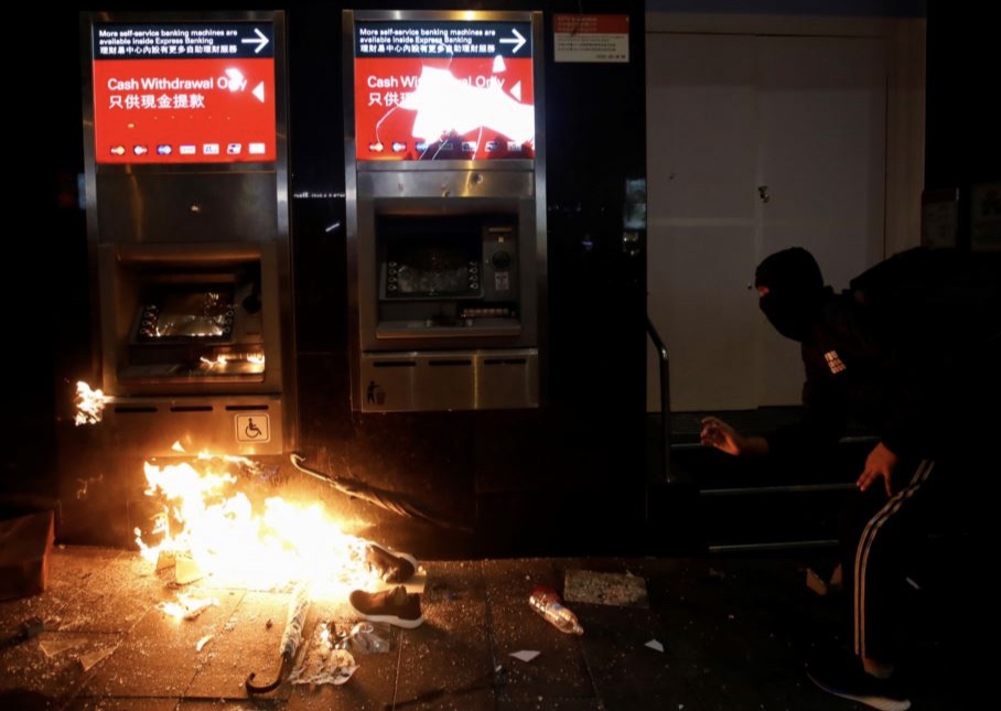 民阵游行演变成纵火破坏,滙丰银行总行外的狮子像及湾仔、中环多间分行被破坏纵火。滙丰银行发表声明,强烈谴责近日接连破坏该行服务及相关设施的不当及无理行为,个别自动柜员机及银行设施,因此需要暂时停止服务。