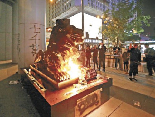 众筹平台“星火同盟”被指洗黑钱,滙丰银行成反修例示威者狙击目标,总行两只狮子铜像于元旦游行期间遭“私了”,被喷红油、贴符及放火焚烧。劳工及福利局局长罗致光在网志指,火烧滙丰银行铜狮子,令人神伤,又指近日不时收到与破坏及纵火相关的新闻,本应是开开心心的日子却添上黑暗色调,又指纵火令他联想起五四运动中的黑暗面,形容学懂生火可说是为人类文明点起曙光,但纵火却可将文明摧毁。