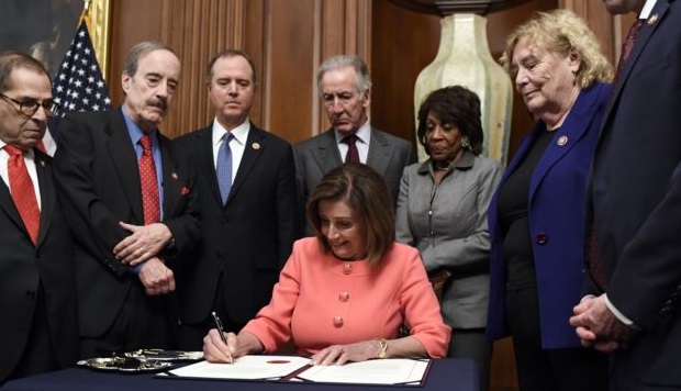 众议院议长南希·佩洛西在星期三的仪式上签署了弹劾条款,把弹劾进程向前推进。在这之前,她有近一个月的时间迟迟不向参议院递交弹劾条款,试图让参议院领袖同意在审判期间传唤新证人,但是没有成功。