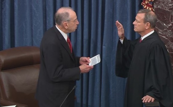 担任参议院临时议长的格拉斯利参议员为首席大法官罗伯茨主持担任弹劾审判主审的宣誓。(2020年1月16日)