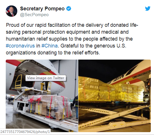 他的推文说:“感到自豪的是,我们迅速提供便利,帮助把拯救生命的人员保护设备和医疗与人道救援捐赠物资送给在中国受到冠状病毒影响的人民。感谢美国组织对救援努力的慷慨捐赠。”