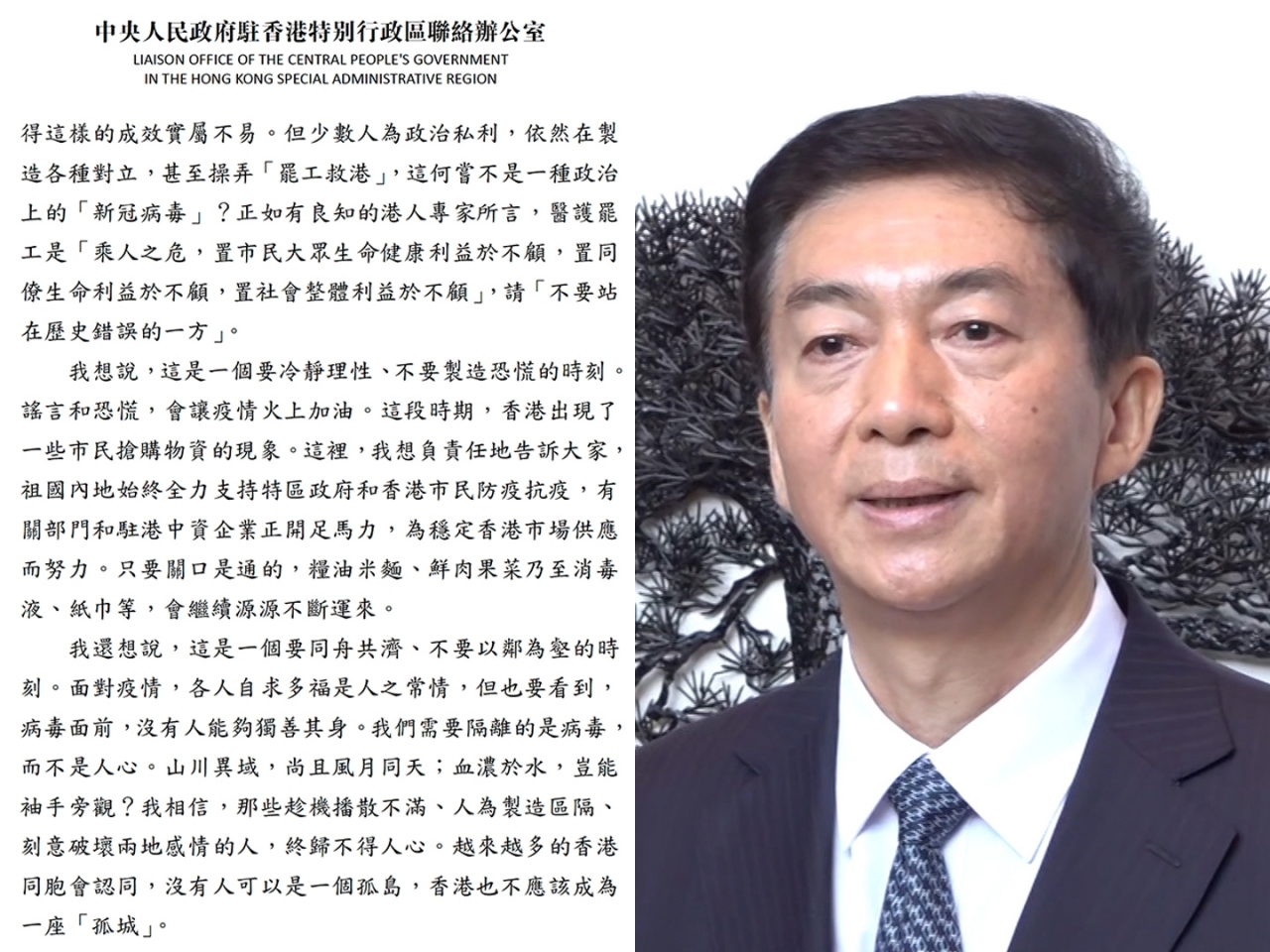 骆惠宁说,指少数人为政治私利制造各种对立,甚至操弄「罢工救港」,反问这是否一种政治上的「新冠病毒」,他引述有专家指,医护罢工是乘人之危,置市民大衆生命健康、同僚生命和社会整体的利益于不顾,希望不要站在历史错误的一方。