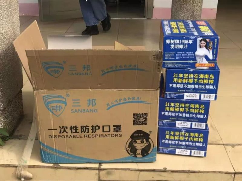 苏荣贵女士在海口市海甸岛经营着一间水吧,因其制作饮品的工作需要,店内储备了一些口罩。疫情爆发后,苏荣贵从新闻中看到政府工作人员为防范疫情辛苦地工作,作为一名老百姓,她也想要为疫情防范工作尽一份力。1月29日下午,苏女士特地驱车40多公里,将一整箱一次性防护口罩、一万元现金和4箱饮品送到海口市龙华区龙桥镇政府。
