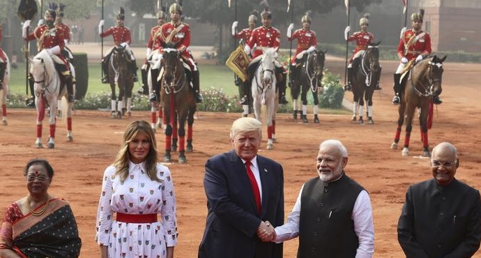 访印第二天及最后一天,特朗普先会晤了印度总统科温德(Ram Nath Kovind),接受三军仪仗队的致意;之后,特朗普携夫人前往印度独立运动英雄甘地陵墓吊唁。