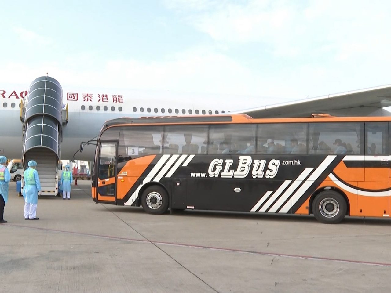 政府派出接载滞留在湖北港人的第三班包机,下午4时半前飞抵本港,穿上保护衣物的工作人员,协助该批港人落机,他们随即乘坐旅游巴,前往火炭骏洋邨接受14天检疫。