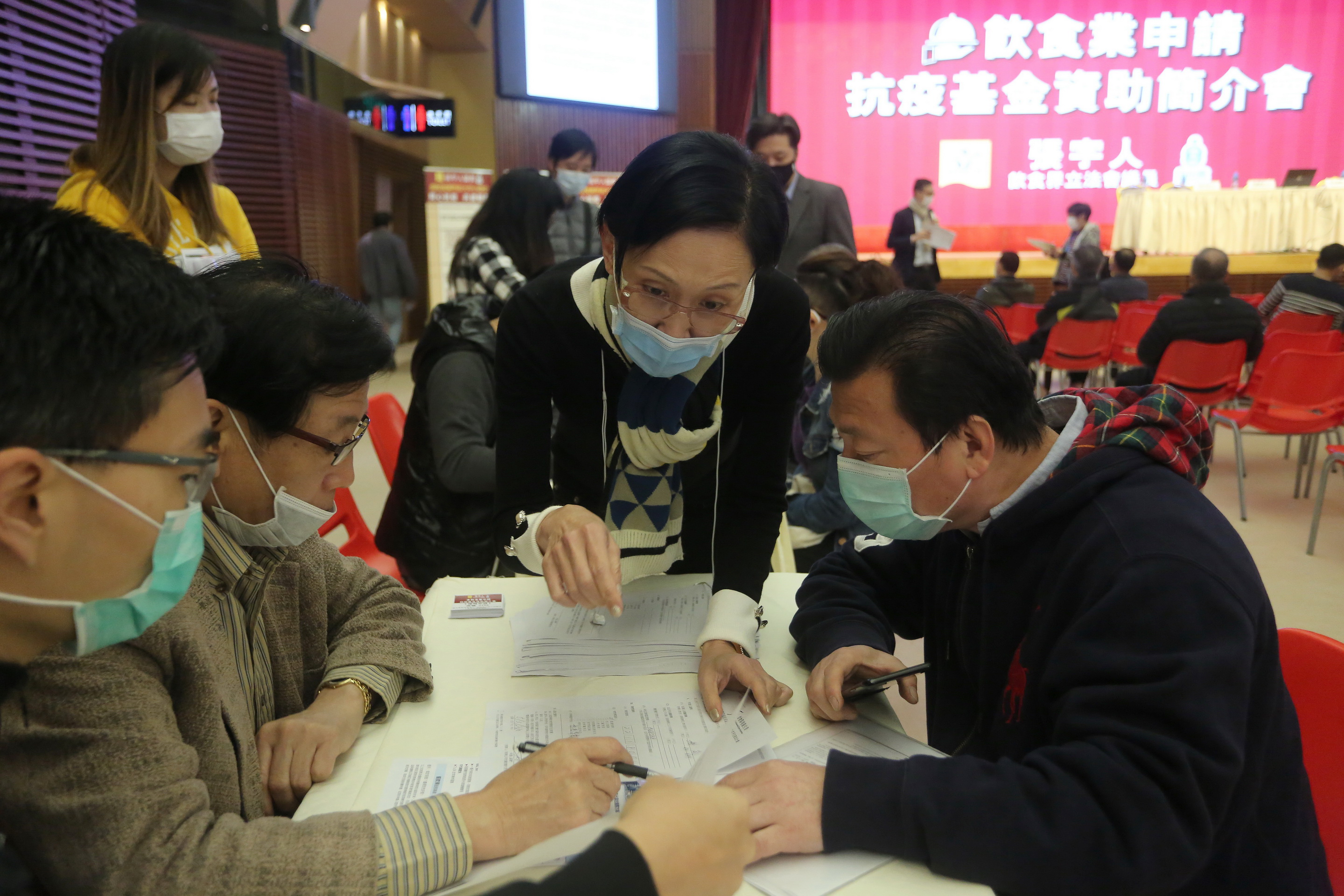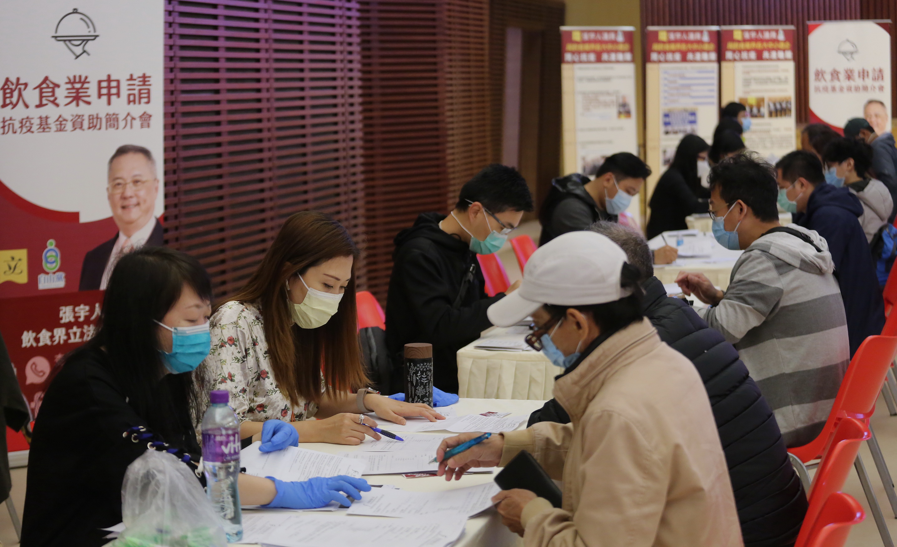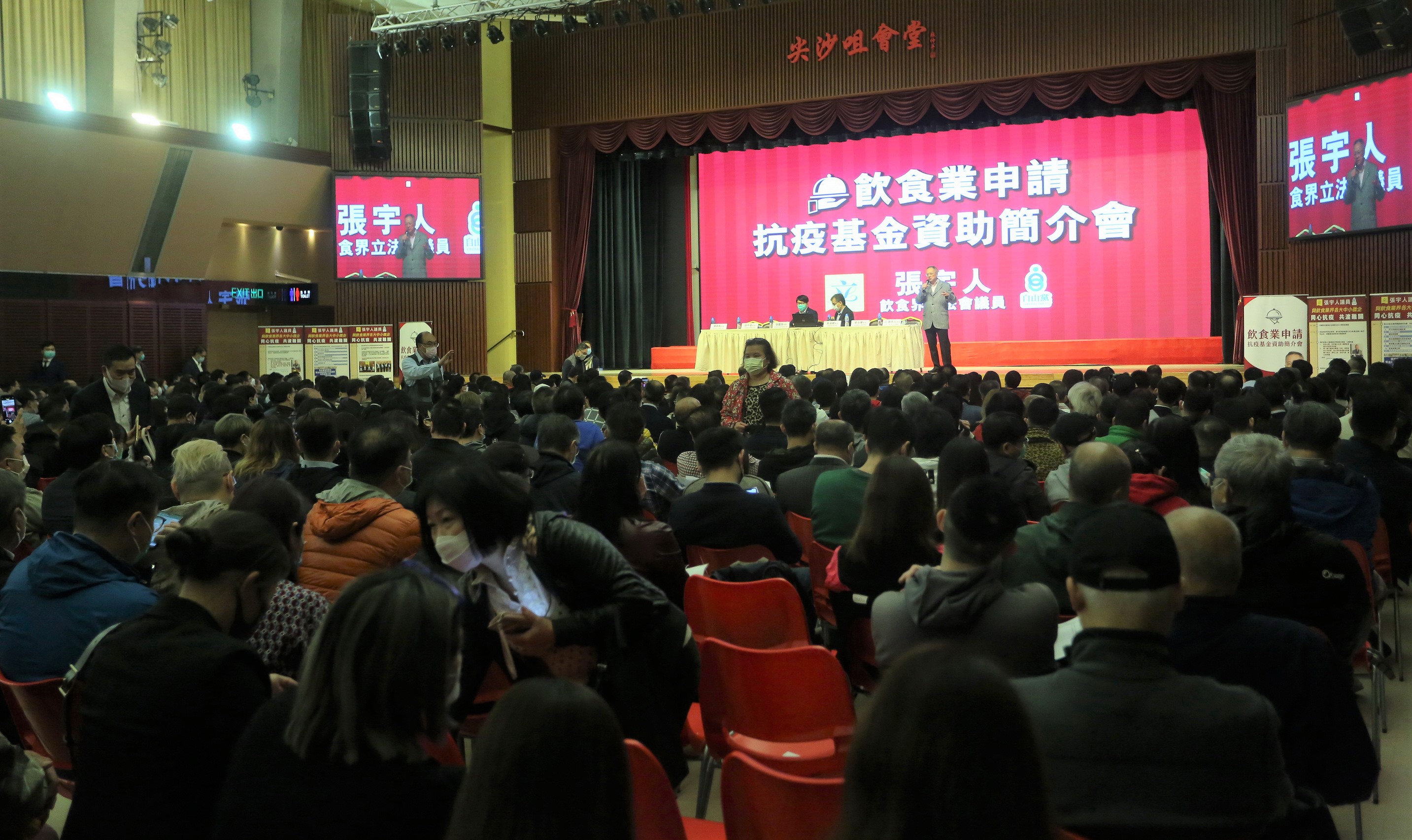 張宇人辦飲食業申請抗疫基金資助簡介會獲逾千業界人士參與,食環署副署長到場講解申請程序, 張宇人為業界即場辦理申請。