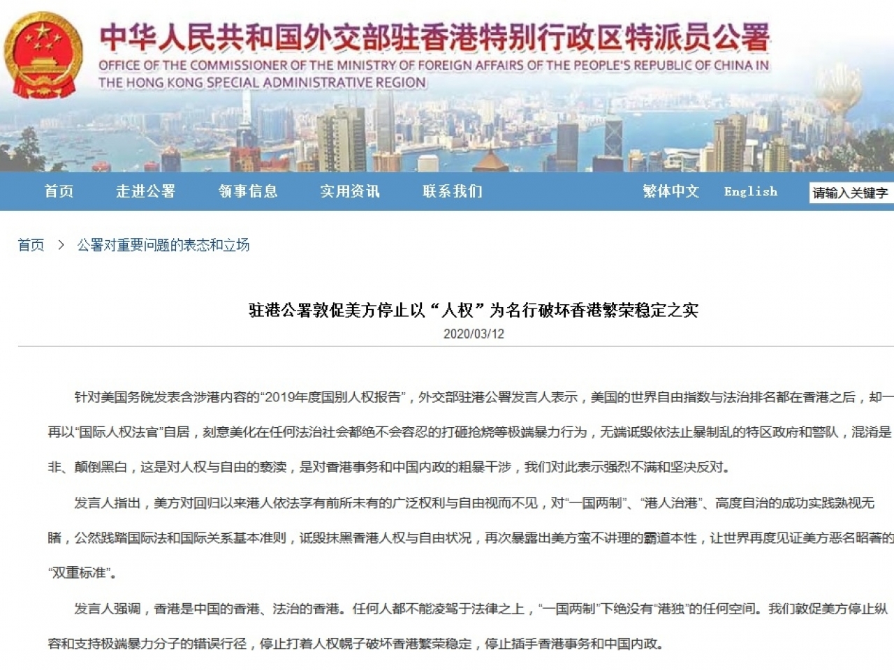 (中华新闻通讯社讯)外交部驻港公署回应美国国务院发表的2019年人权报告,发言人说,美国的世界自由指数与法治排名都在香港之后,却一再以「国际人权法官」自居,刻意美化在任何法治社会都绝不会容忍的打砸抢烧等极端暴力行为,无端诋毁依法止暴制乱的特区政府和警队,混淆是非、颠倒黑白,是对人权与自由的亵渎,对香港事务和中国内政的粗暴干涉,中方对此表示强烈不满和坚决反对。