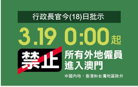 行政长官贺一诚在晚上发出批示,由午夜起禁止所有外地雇员身份认别证持有者进入澳门,但持有内地、香港和台湾身份证的外地雇员除外。以及基于防治疾病、紧急求援以及维持澳门正常运作和居民基本生活需要的例外情况,可以向卫生部门申请豁免。