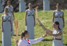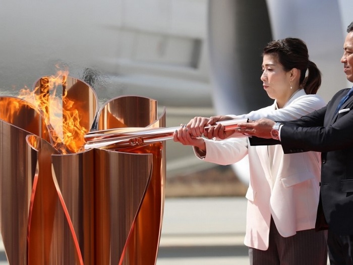 东京奥运的圣火,由希腊雅典运抵日本,运载圣火的专机,早上抵达日本宫城县航空自卫队松岛基地,东京奥组委进行简短的欢迎仪式。由日本男子柔道奥运冠军野村忠宏,以及日本女子自由式摔跤运动员吉田沙保里,一同点燃圣火盆。