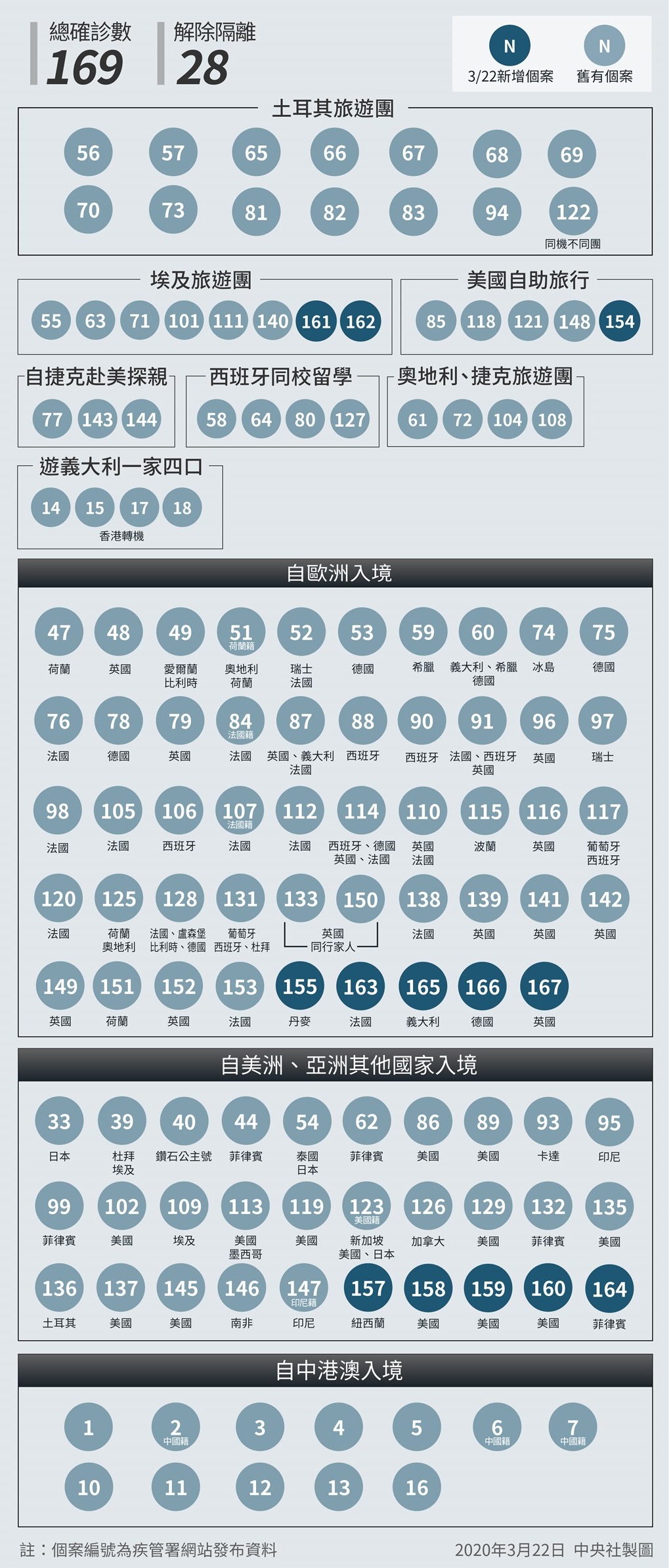 案160、168及案169为案124之接触者,案160曾于3月1日至10日赴美国工作,返台后,曾于14日因头痛至诊所就医,20日被匡列为桉124之接触者后经卫生单位採检,于今日确诊。