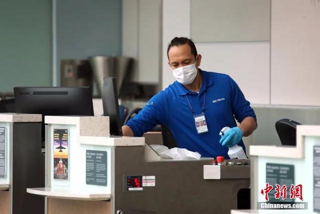 当地时间3月18日,加拿大多伦多皮尔逊国际机场,一位工作人员戴着口罩为值机柜台进行清洁、消毒