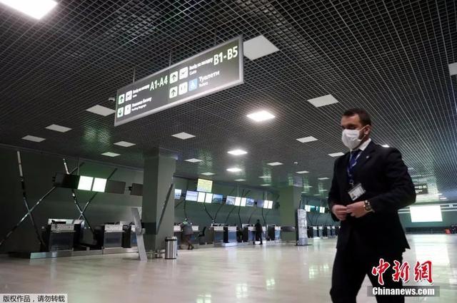 乌克兰首都基辅,一名戴着防护口罩的工作人员穿过伊戈尔西科斯基国际机场的无人值机区域。