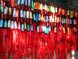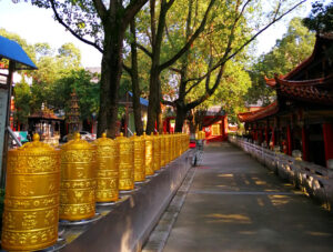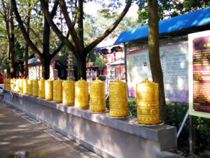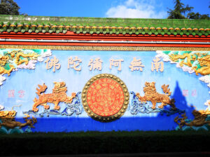 法轮上方是斗大的“南无阿弥陀佛”八个大字;法轮下方是释海空上师篆写的“如意轮金刚法祖庭”;法轮的左右各有两个大字,一边是“显密”,一边是“圆通”,标志着该寺是一个显密兼修的道场。照壁背面,中央有个特大的“福”字,到这里的男女老少,总忘不了闭着眼去触摸“福”字,都希望从此五福临门。