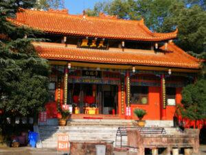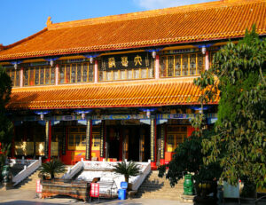 观音殿是一座高大的双层建筑物,远看如飞阁流丹。铁红色的高窗亮格庄严肃穆,金黄色的琉璃瓦光彩夺目。 观音殿殿名是中国佛教协会会长赵朴初老亲笔题写。书有“大悲殿”三字的横额牌匾高悬在大殿的上方中央。
