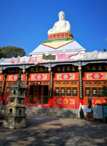 穿过天王殿,越过地藏殿或伽蓝殿,徒步登上宽76米、高5米的条石保坎就可看到中国目前一绝的大佛殿。大佛殿的屋顶上是一座二十多米高的乳白色露天大佛。大佛的莲花座下是白塔寺的藏经楼和闭关室、正前为方壁上有八个金色大字“开发智慧、觉悟人生”,壁下刻有一个两米见方、刚劲有力的大“佛”字。