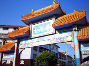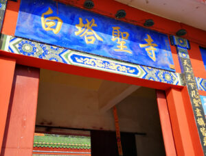 顺着白塔的方向很快来到直通白塔寺的那条街上,首先引入眼帘的是别具一格的三重檐古代牌坊的白塔寺山门,在交通要道的“十字口”分外惹眼、“白塔寺”三个硕大的字,异常醒目地镶嵌在山门顶端。四对石狮驮着山门,守护着释海空亲自撰写的耐人寻味的楹联“觉起万门万门归一门门门总因缘生”、“缘生一法一法通万法法法皆由心造”。