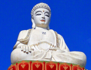 进入山门,老远就能看见寺内乳白色的露天大佛。一条宽18米,长400米的仿古大街直达白塔寺的彩色照壁。照壁正面,浮雕是由四条腾飞的金色巨龙守住大海四角。大海中,两头威猛的金色麒麟保护着巨大的金色法轮。