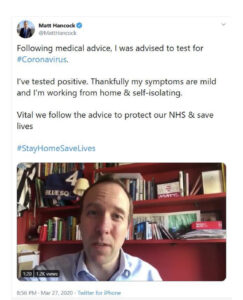 分类 国际 英國快訊 英国卫生大臣中招新冠肺炎 文章作者 英国总分社 赵雪湄 发布日期 2020年3月28日 (中华时报英国 赵雪湄)继英国首相鲍里斯.约翰逊之后,英国卫生大臣汉考克也在社交媒体上称,他的新冠病毒检测呈阳性。 ← 敬业善举树立中国正面形象 → 一文读懂全球疫情:全球新冠肺炎累计确诊病例超59万 美国累计确诊破10万