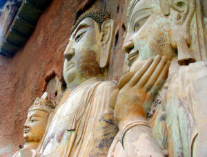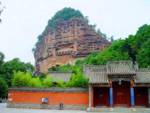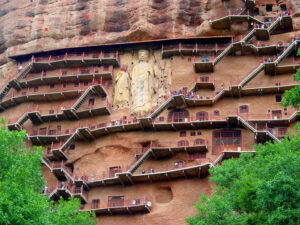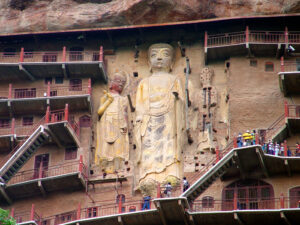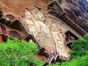 在石窟群中,首先映人们眼帘的是凭崖而凿的一组雕刻造像。中间一座佛,高达15米,左右两尊菩萨侍立,喜笑颜开,迎送来往游客。现在的麦积山,经过大规模的修整、加固摇摇欲坠的崖体非常稳定,山上的栈道也宽阔整齐,十分安全可靠。