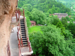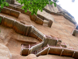 栈道云梯修建于悬崖,浅龛深窟开凿于峭壁其建筑高超雄伟,工程奇险浩大。人们可以放心大胆地登临各个崖阁,进入各个洞窟。登上石窟极顶远眺,山下郁郁葱葱的美景令人心旷神怡。尤其是首次雨中麦积山的秀色更是一道别有洞天的风景线。