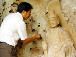 由于年代的久远,如今的麦积山石窟也受到了不同程度的风化及破损,为此麦积山的文物保护部门加大了修缮的力度。记者在石窟上参观时,看见一个工作人员正在仔细地修复石窟。他向记者介绍说,每天都有文物管理工作人员分几个组在修复破损的石窟。虽然工程浩大,但日积月累的修复工作会使麦积山石窟得以日见完好的保护。