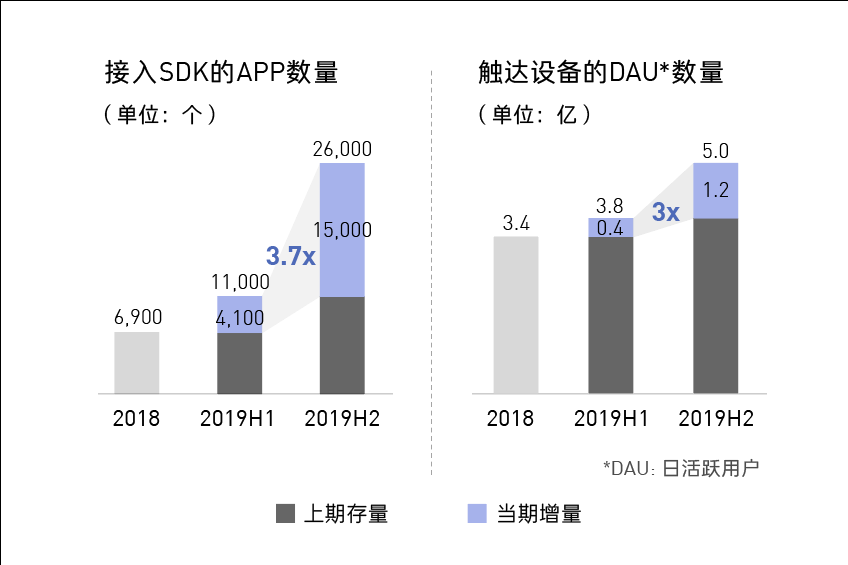 2019年4月,Mobvista旗下程序化交互式广告平台Mintegral的SDK开始陆续被各大主流聚合平台接入,程序化广告流量显著增长。截至2019年12月31日,接入其变现SDK的APP数量,从2018年同期的6,900款猛增至26,000款,其中2019年下半年增量为上半年的3倍; DAU从3.8亿提升至5亿。
