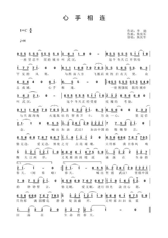 (中华时报记者晓港讯)“…… 一座坚强挺拔的城市叫武汉/这个冬天正经受着疫魔的考验/与天涯海角火速集结的智勇卫士/万众一心坚定信念/喊出加油武汉加油中国的铿锵誓言/情无边爱无边黑夜之灯点亮璀璨/只待那满目春风唤醒大江两岸/又见那涓涓暖流涌荡在生命的春天”。……近日,内地著名作家、诗人、词人李勋与北京著名音乐人焦庆军联袂打造的一首“抗新型冠状肺炎疫情”的歌曲《心手相连》,被国务院国资委选为抗疫经典战歌,将在全国国资系统进行广泛宣传和播放传唱。