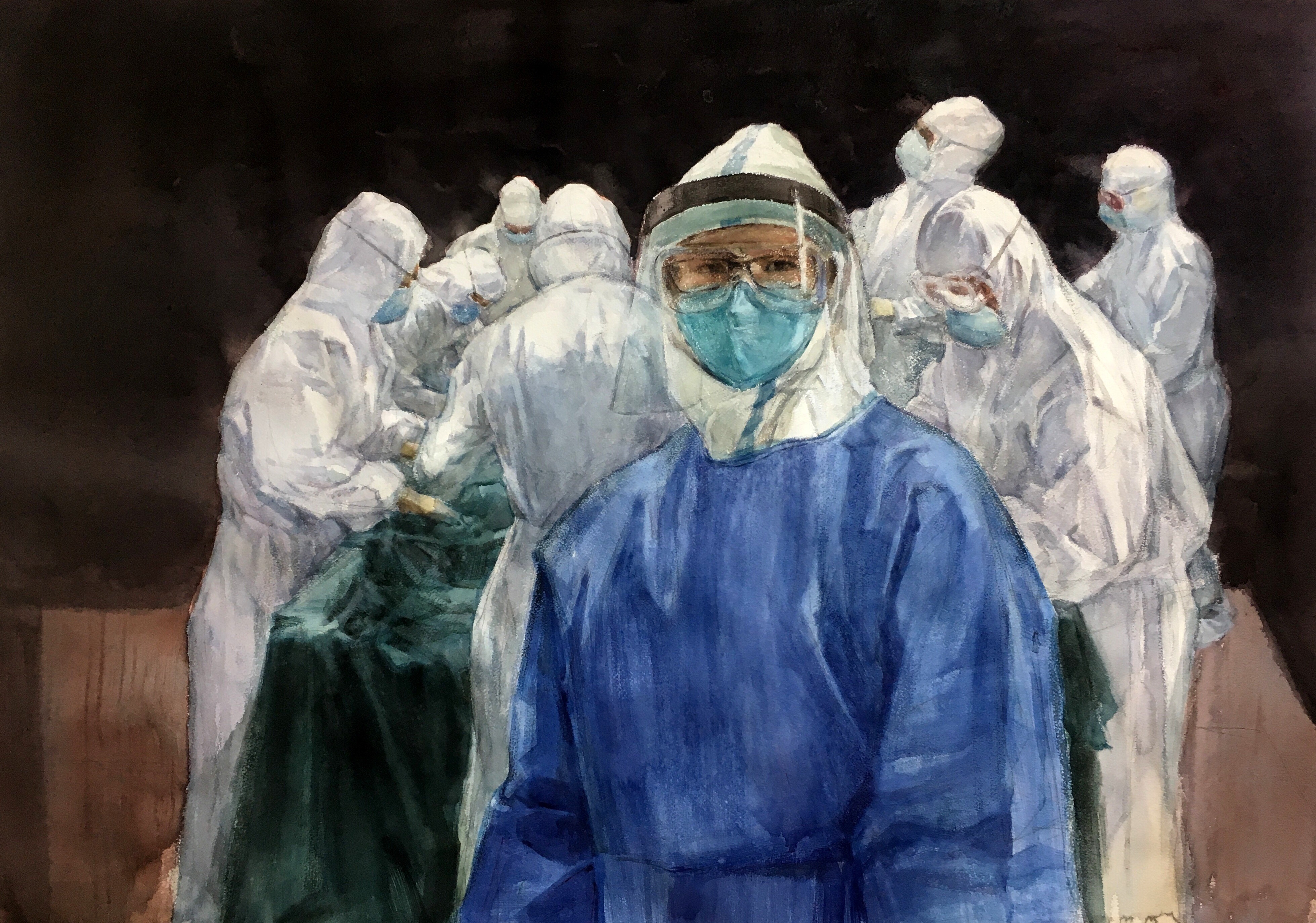 作品说明:2020年伊始,一场始料未及的新冠肺炎疫情灾难以中国武汉为中心席卷整个中国大地,全国停工停产停学停动,一切陷入瘫痪,举国惶恐。就在这一危难时刻,国家积极响应,全面部署,号召全国医务人员支援武汉,于是全国医务工作者逆行而上踊跃报名,奔赴前线,留下无尽牵挂与悲伤给亲人。此作品便是寄托了亲人与家乡人民对医务工作者大无畏精神的弘扬及牵挂与祈福之情。