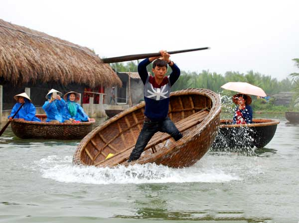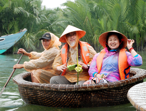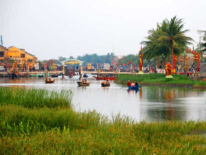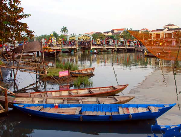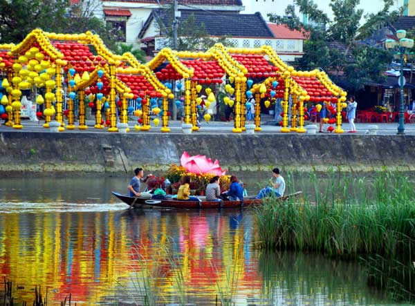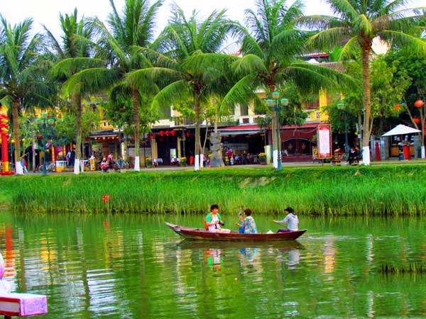 顺着秋盆河岸畔漫步会安古城,只见在椰林依偎的秋盆河景色秀丽,游人们则乘坐一条条小木船在水中悠闲地泛舟而行,好不浪漫。河岸上的小吃排挡连成一片,特色小吃数不胜数,一幅幅浓郁的异国民俗风情景象似电影画面,连续不断地映入游客们的眼帘。
