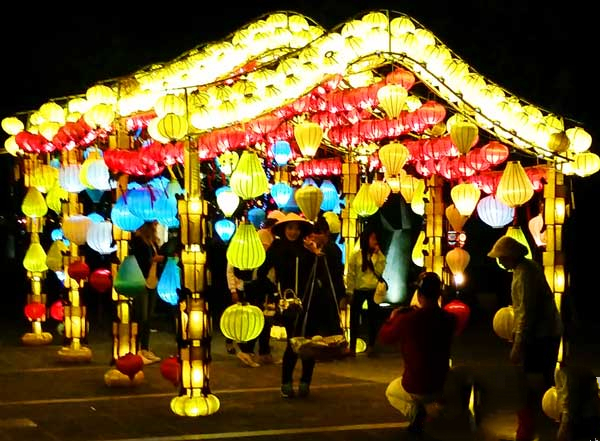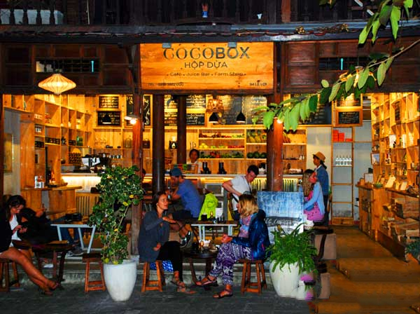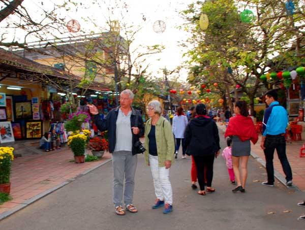 夜幕降临,五彩缤纷的灯火将古城装点得越发温馨动人,游客漫步会安古城街巷感到无比惬意。只见主街两侧是鳞次栉比的小商品、工艺品、餐厅、咖啡厅等店铺,其装饰的风格多样,多姿多彩;街旁还能看到不少现场进行的人像绘画秀;摩肩接踵的人流中不乏世界各国的游人,所以会安古城显得极为热闹。