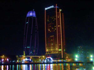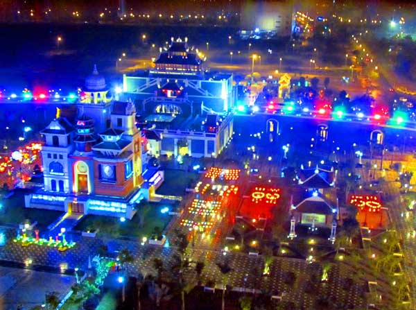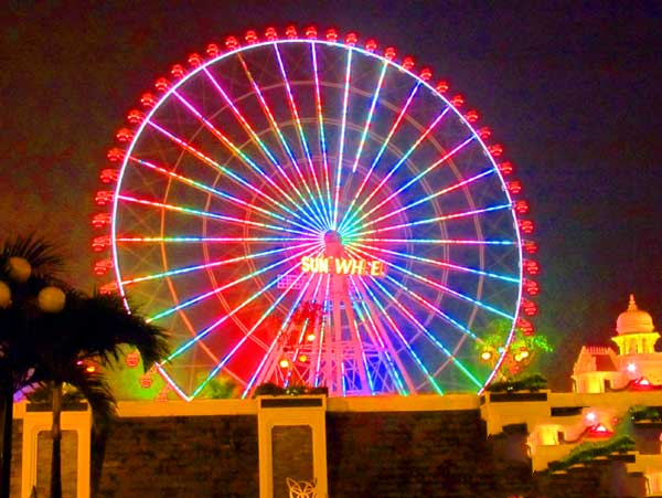 傍晚,在岘港著名的五星级皇冠大酒店,大家品尝了一顿风味十足的海鲜火锅大餐。之后来到夜色中美丽的岘港亚洲公园观光。亚洲公园最为著名的就是高达115米的摩天轮,被五颜六色灯光装饰的摩天轮在夜色中极为醒目,由于其鹤立鸡群的高度,夜晚在岘港城区的任何一个角度都能看到其靓丽的身姿。摩天轮几乎成了岘港的地标式景点,每到夜幕降临,当河岸的灯光渐渐亮起时,流光溢彩的摩天轮总是那么浪漫璀璨夺目。