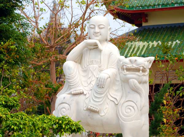 观音像后面有一座灵应寺,寺名和中国杭州的灵隐寺仅一字之差。灵应寺大门上的横额和楹联,以及寺院内各殿的楹联,几乎都是汉字,由此可知越南的佛教文化应该来自中国。在寺前大殿广场的两旁是两组面向而立的罗汉像,只见每座金刚菩萨像雕刻得都栩栩如生,惟妙惟肖;其神态各异,有的憨态可掬;有的安详、机智、诙谐;有的则狰狞恐怖,而每位坐骑的种类也各不相同。