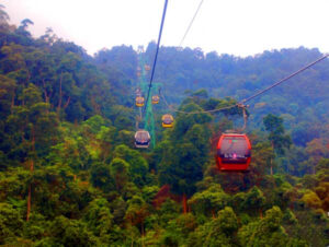 大巴车经过一个多小时的行程抵达巴拿山脚下。在阿秋的引领下,来到缆车站乘索道登山开始拉开巴拿山一日游的帷幕。在六个人一个包厢的缆车中徐徐而升,往下俯瞰,巴拿山茂盛的热带植被风光一收眼底,白色的湍湍溪流,在绿树丛中的岩石山涧中滚滚流淌不息。