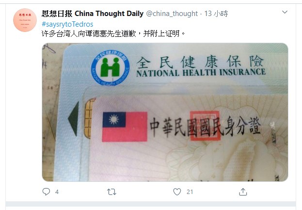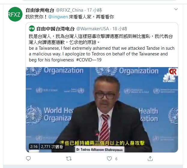 调查局今天召开记者会表示,全体自由电台中文网推特帐号昨天发表「谭德塞称台湾进行人身攻击」相关文章,当天下午该则贴文即出现一名用户「以台湾人之名发表道歉留言」,经溯源调查,该用户应来自大陆。