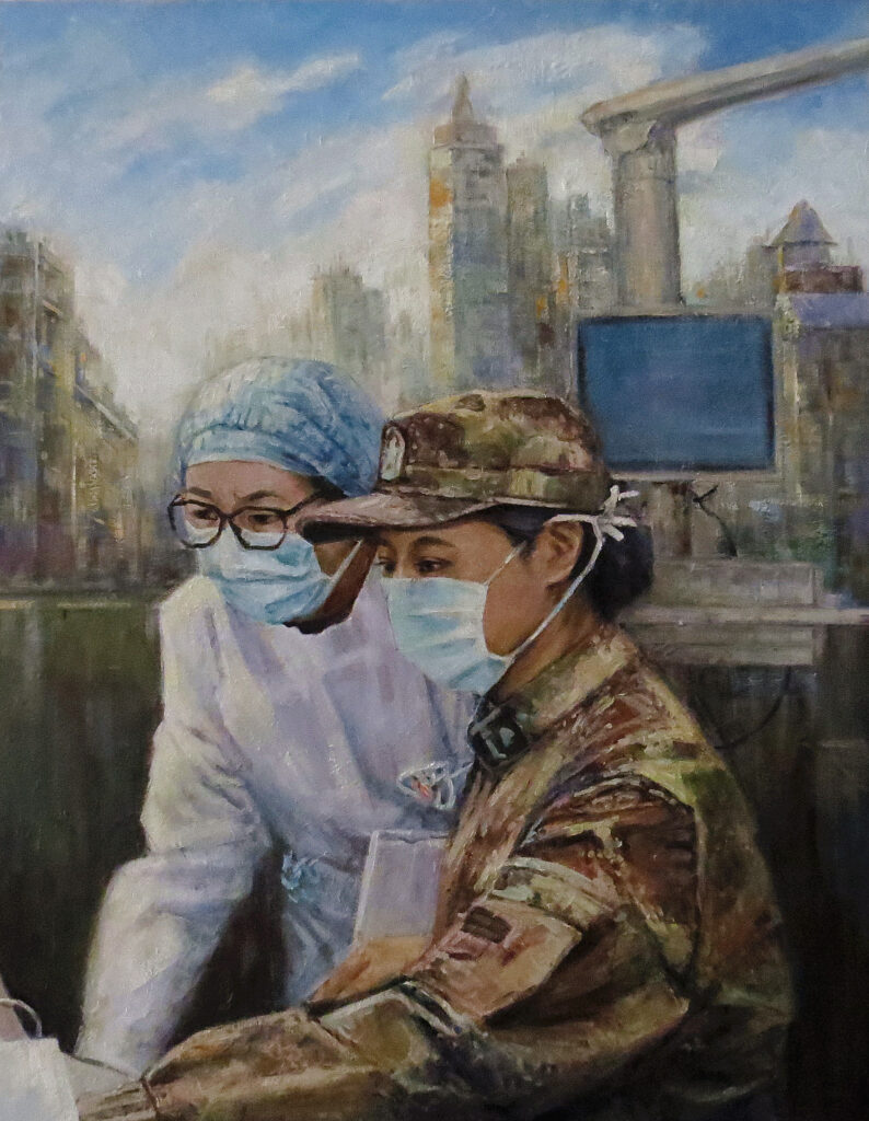 作品说明:作品描述了医护人员把人民群众的生命放在第一位,一丝不荀的工作态度,敬业执着的动人画面,作品以油画写实的形式创作,