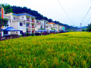 当晚,车友们下榻在被称为长寿巴马健康中脉的坡纳村中的农家旅馆。旅馆位于一片绿茵茵的稻田旁,稻田边是与旅馆相对应,一家连一家带遮阳篷的排挡。晚上,车友们在此闻着稻田的花香,品味着巴马当地的烤香猪、腊肉等佳肴美味开怀畅饮,好不快活。