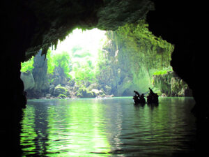 驶船游览,洞内沿途景观三暗三明,暗处如水底龙宫,明处如见通天潭,洞中水,水中洞,水转山移,水啮山穿。四周悬崖险峻,壁上岩溶景观千奇百怪,引人入迷。