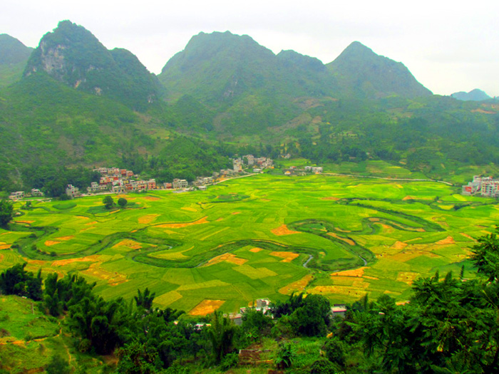 命河是巴马母亲河盘阳河的源头之一,也被称为那社河,在那社乡田垌里左拐右弯,从这里的观景台居高俯瞰,蜿蜒曲折的河流造型,酷似草书的“命”字,因此,当地人就称它“命河”。借用庄子之道说,该地占据了“天地人合一,人浑于自然”的佳境;“命河”是长寿之乡的象征,也是天昭巴马长寿的地理标志。