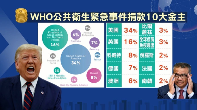 而作為國際上最大的政府間衛生機構,WHO資金預算2年一輪,來源包括「會員國會費」和「自願捐款」,因此一直以來世衛的10大金主,包括會員國美國佔了世衛資金34%,英國則以16%居次,當中更包括 「自願捐款」的微軟創辦人比爾蓋茲,他也透過基金會名義捐助,幾年下來共60億美元,約佔世衛資金比例3% ,不過世界衛生組織的資金運用,也讓人詬病。