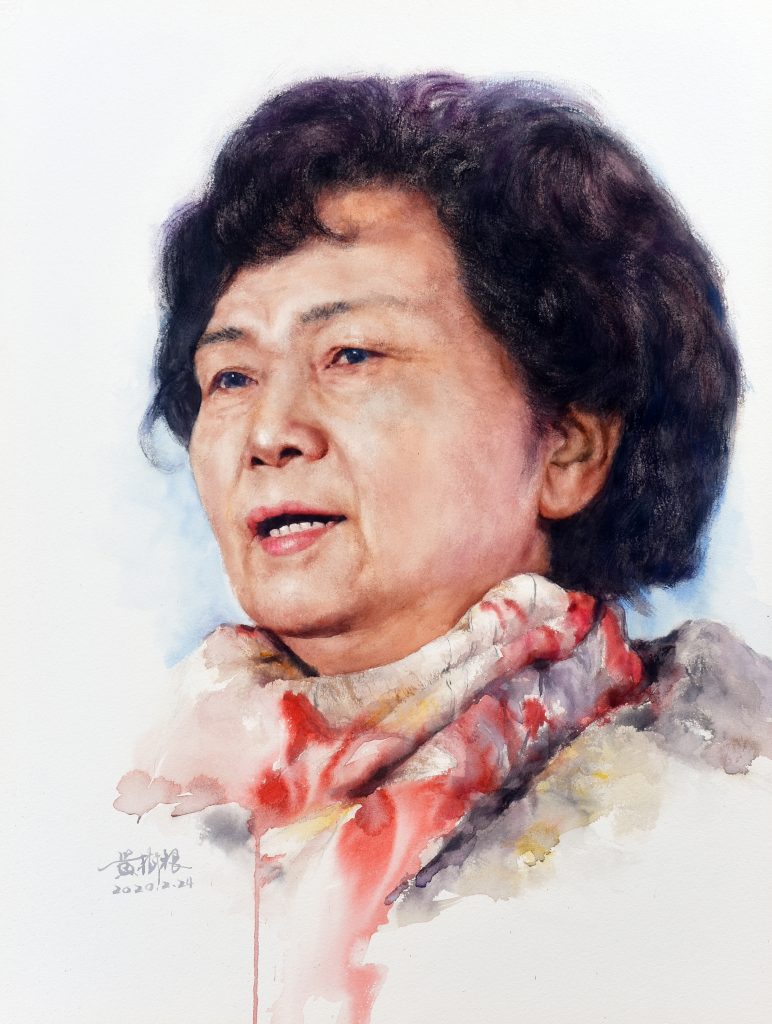 作品说明:肖像形式细致刻画院士李兰娟带领科研团队演讲神态,仰视角度表现其学术领军老当益壮的伟岸一面。