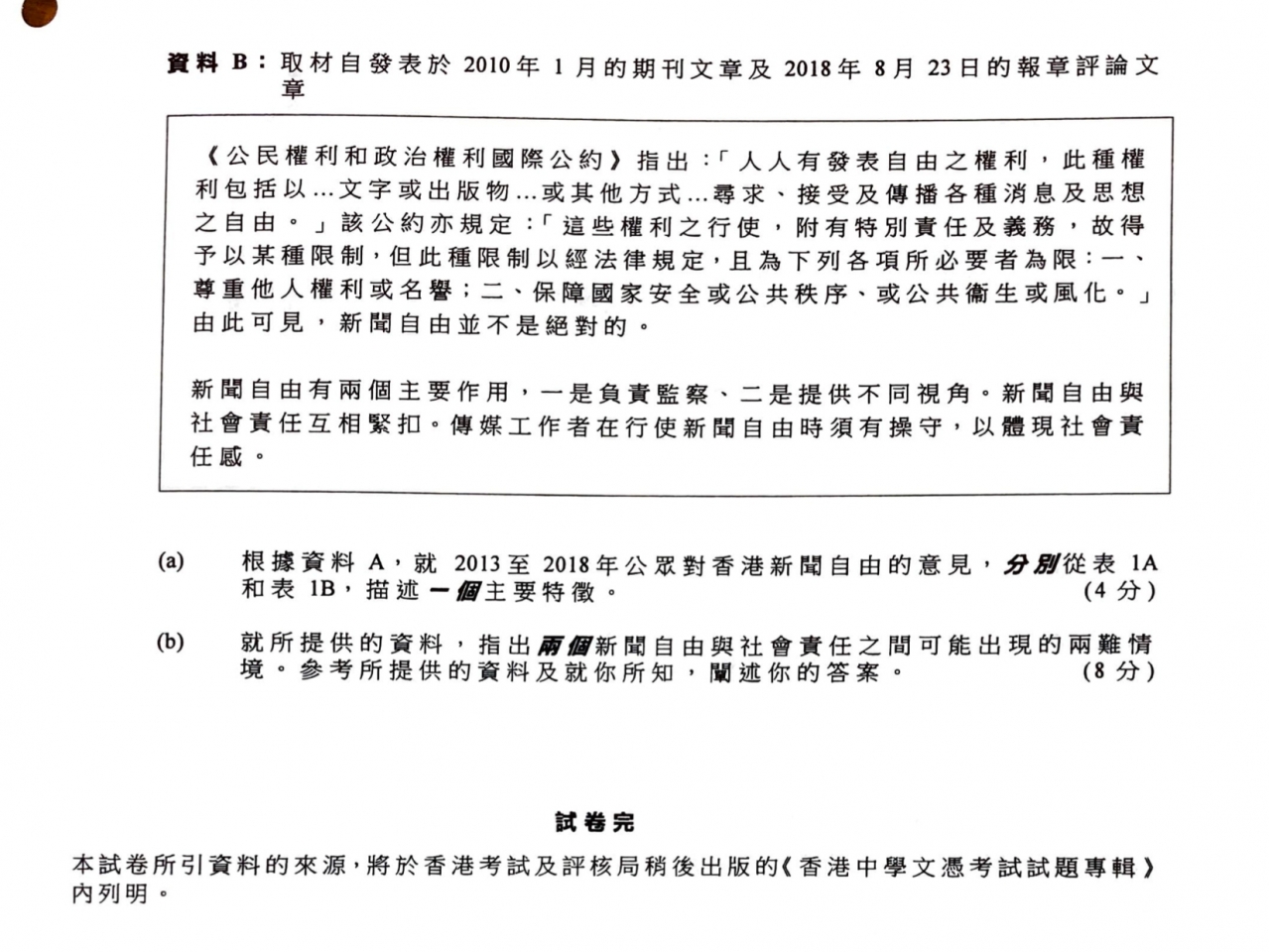 香港文憑試通識科今天開考,分為卷一及卷二。卷一其中一題必答題,要求考生按試題提供資料,描述公眾對新聞自由的看法,以及新聞自由及社會責任之間可能面對兩難的局面。