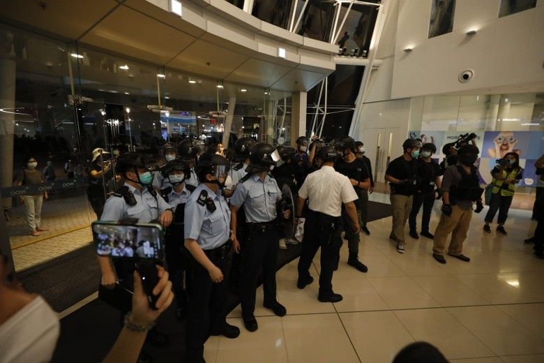 大批警察在7時半進入商場,呼籲示威者不要聚集,立即散去,否則票控,並拉起封鎖線,但示威者並無理會,繼續叫口號。到8時許,警察在商場外驅散另一批集會人士。8時半,有人投擲玻璃樽,警察追上前,但拉不到人。警察又舉起黃旗,警告示威者可能被檢控。