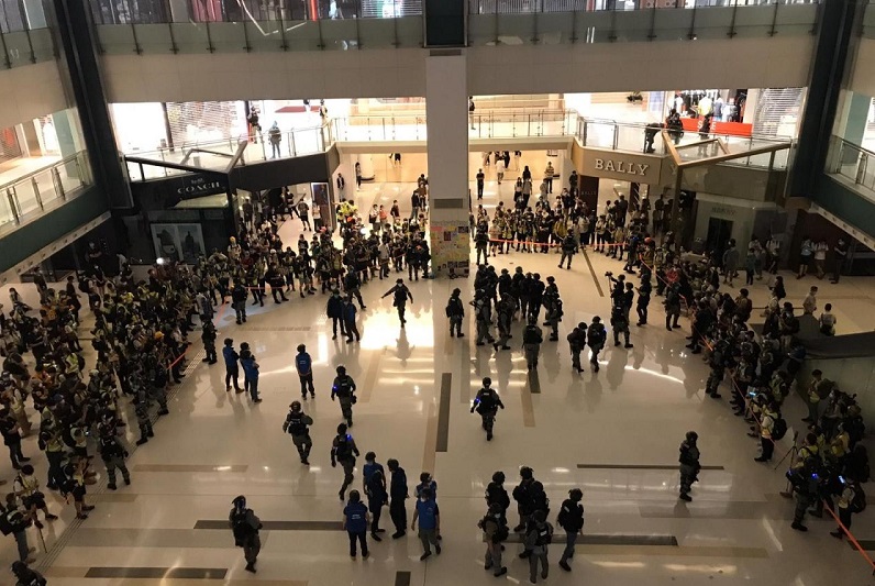 至晚上约8时半,一批防暴警员在中庭楼层扩阔封锁范围,要求市民及记者向大会堂方向后退,期间有记者怀疑被警员推跌。另一批警员到商场外截查年轻人,而在商场不同楼层,分别有人继续高叫口号。