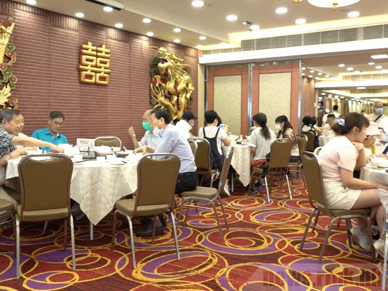 政府即日起放寬「限聚令」人數由4人至最多8人,食肆每枱最多可坐4人的規定亦放寬至8人。中午時分,旺角一間酒樓幾乎全場爆滿,接近所有可容納6-8人的大枱也坐滿。