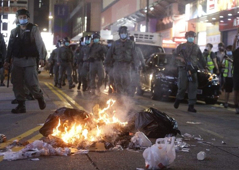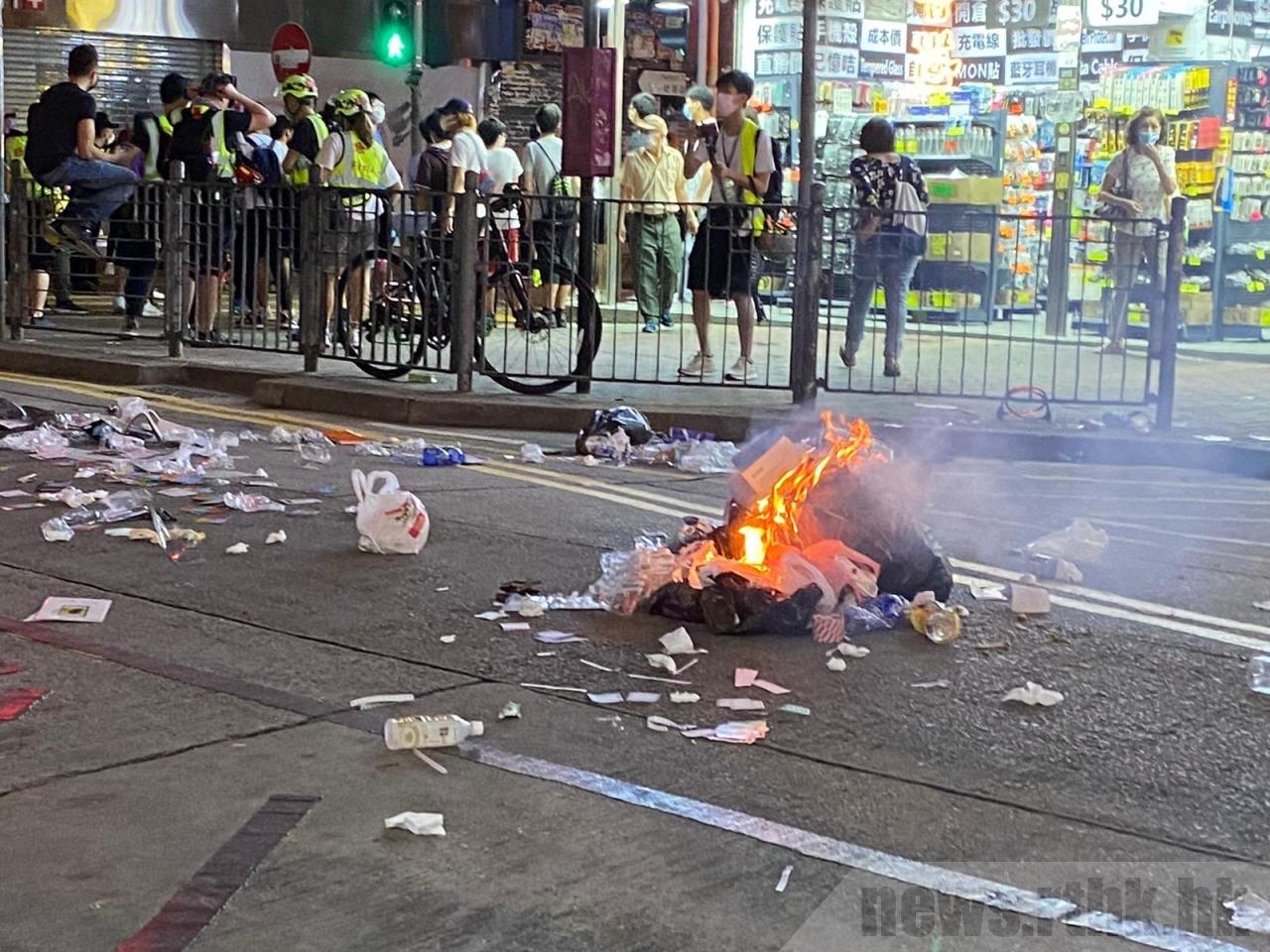 至晚上9時許,繼續有大批人士在西洋菜南街及山東街一帶聚集,有人將垃圾桶搬出馬路,繼而縱火焚燒,火勢一度猛烈冒出濃煙,未幾自行熄滅。大批防暴警之後趕至,並且衝前驅散,至少3人被撳地制服。現場消息指,他們懷疑曾向警車投擲垃圾及堵路。另一方面,一批防暴警在花園街附近布防期間,有人疑從附近大廈高空擲物,期間無警員被掟中。警方之後在附近設下封鎖線,並用電筒照射附近大廈各層觀察有無可疑人士,部分人擎長槍戒備,惟並無發現,隨後撤離現場。